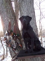 Raven was whelped on Jan 24 2006. She came to us from "Stumptowns" Kennel in Wisconsin. Kurt Turner (breeder) is well known in the field trial and hunt test circuits. Raven’s pedigree is loaded with Hall of Fame Field Trial Champions (view pedigree). She earned her Junior Hunter AKC Title on June 30th 2007 and is currently training for her Master Title. In addition to being a stylish, talented hunt test pup, she is 55 pounds of muscle and speed. She has become one of our primary gun dogs. We have hunted pheasants, quail, ducks, and geese across the Midwest. Raven's bloodline is loaded with talent and she proudly displays her talent in every hunt. She is a natural marker and runs her blinds extremely well. We really enjoy watching her hunt, flush and retrieve pheasants. We have hunted Raven in many different waterfowl settings; (boats, blinds, coffin blinds, tree stands, remote stands). She is a very sensible hunting companion and quickly adapts to the hunt. Raven’s water entry is amazing and her desire to retrieve sends her 15 feet out before she ripples the water (photo of water entry). Raven has accomplished much in her first two years both in the field and test. Raven is the ability to be one of our Best at Mud Creek retrievers! We are anxiously awaiting her first litter in 2008. We have planned a litter with Deacon. These pups should be perfectly sized, and full of retrieving talent. Keep an eye on this little girl, she is special!